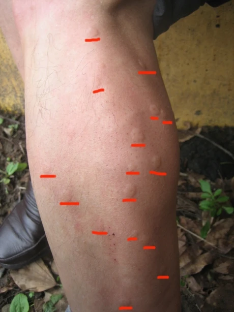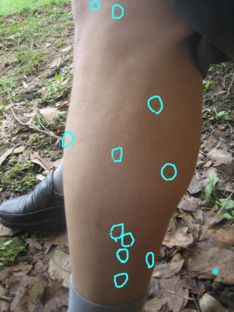 為了正式驗證防護液的防禦效果,研究團隊請教了小黑蚊防治推廣中心的人員,他們說明小黑蚊通常是在人不走動時才會靠近,而且牠們活動的範圍主要是接近地面,所以正式的測試,必須人是靜止不動,且以小腿作為小黑蚊的標的物。經過小黑蚊防治推廣中心人員的指導,研究團隊選定了北部一個中高密度~寶山地區作為戶外測試區,第一次正式上場前,團隊人員可謂「信心滿滿」,因為自認可以有90分鐘的防禦小黑蚊叮咬的能力,先進行空白密度測試,哇~怎麼2分鐘不到,腿上就有十幾隻左右的小黑蚊,天氣沒那麼熱,測試人員倒是被叮得冒出一身熱汗,這裡的小黑蚊密度真不是蓋的...好不容易熬過空白密度測試,期待等一下使用「防護液」時,能感覺到樹下的陰涼!